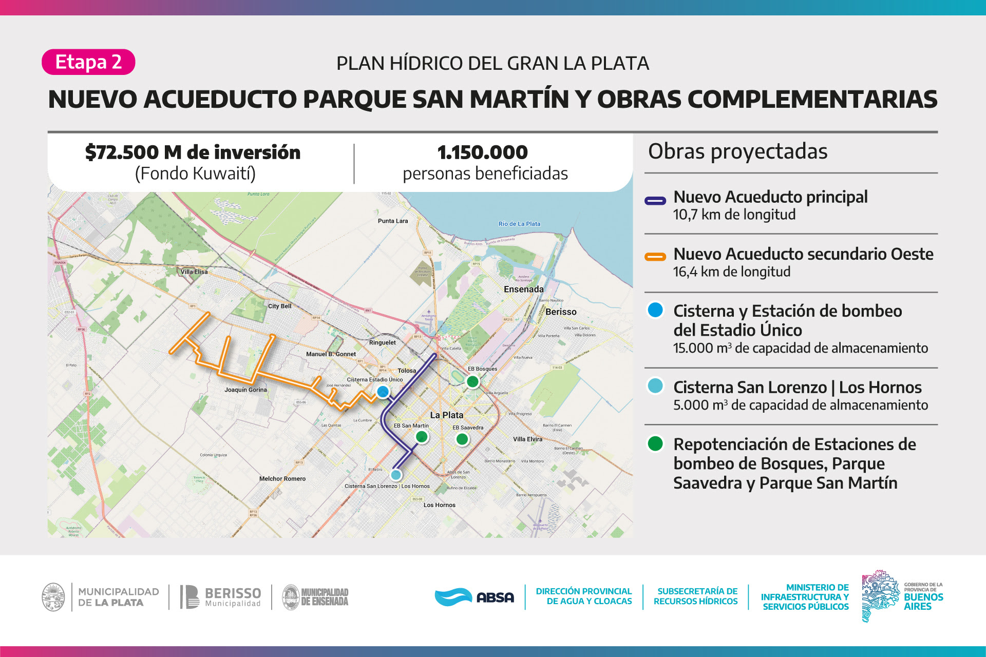 Se construirá un nuevo acueducto de 10,7 kilómetros de extensión que irá desde la Rotonda Distribuidor hasta avenida 31 y calle 52. También se ejecutarán derivaciones hacia cisternas de regulación ubicadas en el Estadio Único, los antiguos Talleres Ferroviarios y la Usina Parque San Martín.