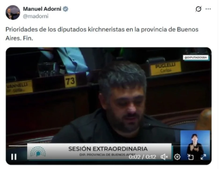 Adorni reaccionó en redes sociales con un mensaje irónico, acompañado por un video del recinto, cuestionando lo que definió como las “prioridades” del kirchnerismo en la Provincia de Buenos Aires. El posteo generó una inmediata respuesta política y escaló en pocas horas.